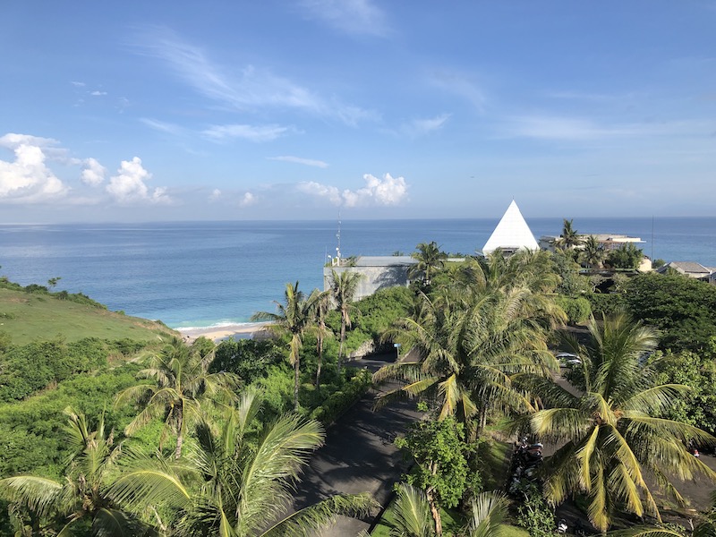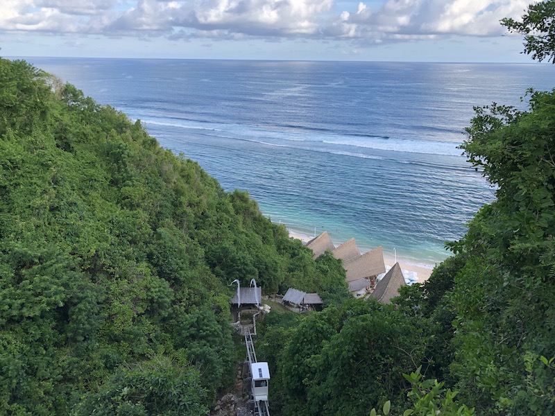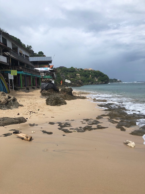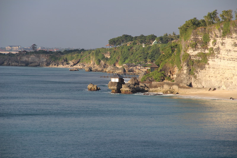 Dreamland fica logo depois de Balangan, dentro de um complexo com resorts e propriedades de luxo. Este abaixo, é o Klapa Resort, passamos uma noite nele. A praia tem uns 100 metros, com areia branca. Com mar aberto, as ondas são fortes. É preciso descer uma trilha de uns 10 minutos caminhando e pelo caminho se vê alguns templos.